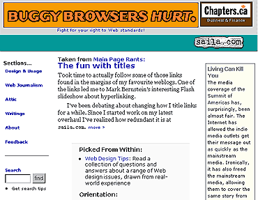 saila.com solidified its move to fully separate presentation from structure in this design. The site iteself was reshaped to emphasis what the site had become: a resource about online journalism and Web building. As well, sidebars and advertising were common on most pages.